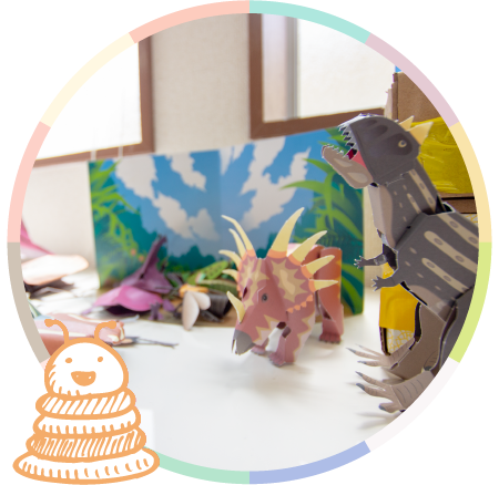 創作活動は季節に合わせた工作や行事につかう物づくり、ダンボールで恐竜や自分のつくりたい物を工夫しながら楽しんでつくります。ハサミやのり、テープの使い方が苦手な子にはスタッフが手助けをしていきます。