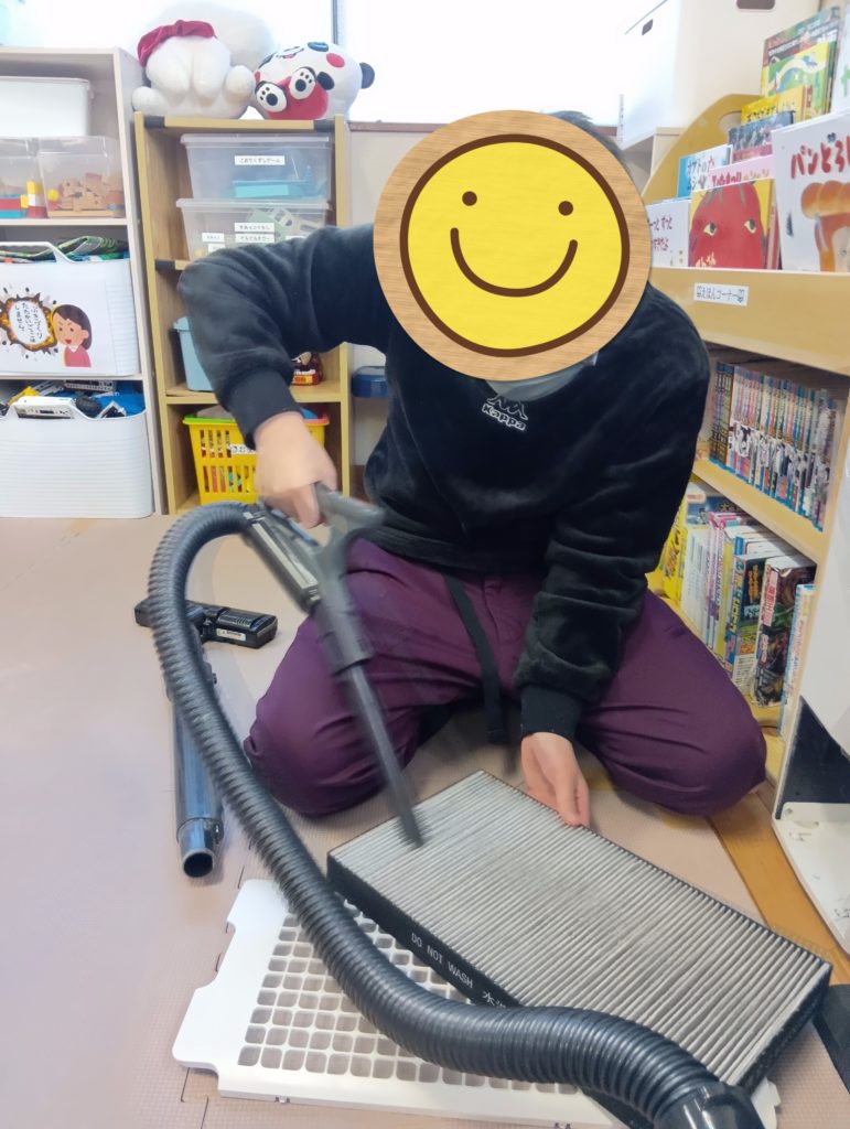 空気清浄機の掃除をしてくれています。色んな事に挑戦してくれ成長する姿が見られますね。