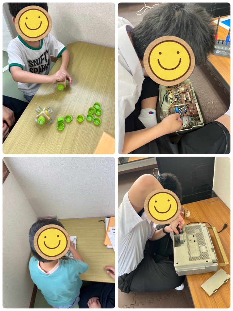 こちらの写真は個別チャレンジに取り組んでいる様子です。左上はキャップ外し/キャップ止めです。指先の力を鍛えるトレーニングになります。素早く外し止めることができました。左下は洋服畳みです。洋服屋さんに置いてあるかのように綺麗に畳めています。右上下はラジオの分解をしています。どうやったらうまく外せるか、思考力がつきますね!
