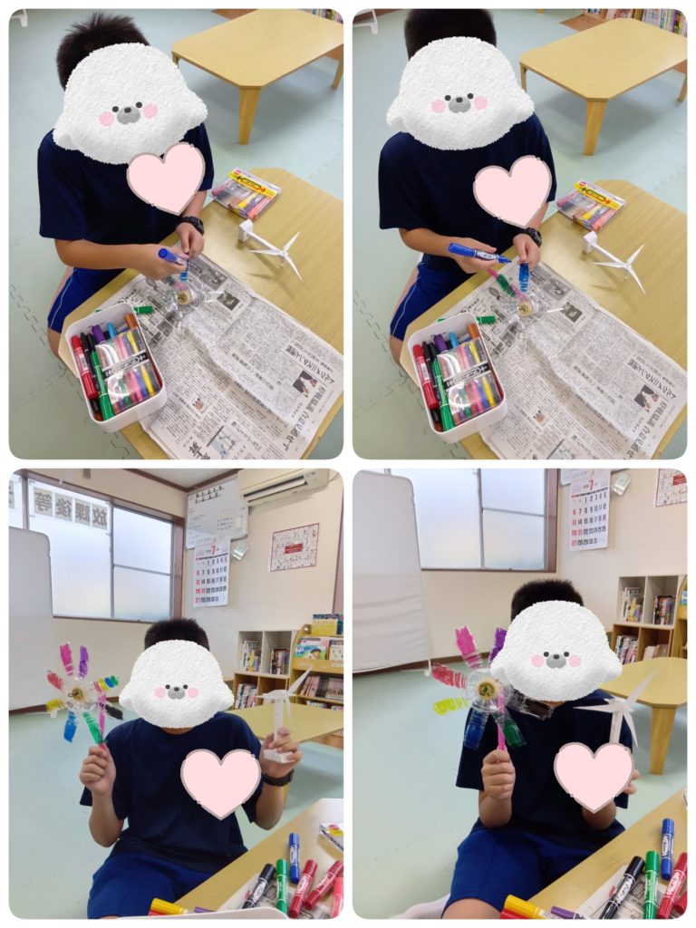 大好きだという風車をカラフルなものとリアルなものと2種類作成したお子様もいます!どちらも風を当てると回るという本格的な作りなのです!